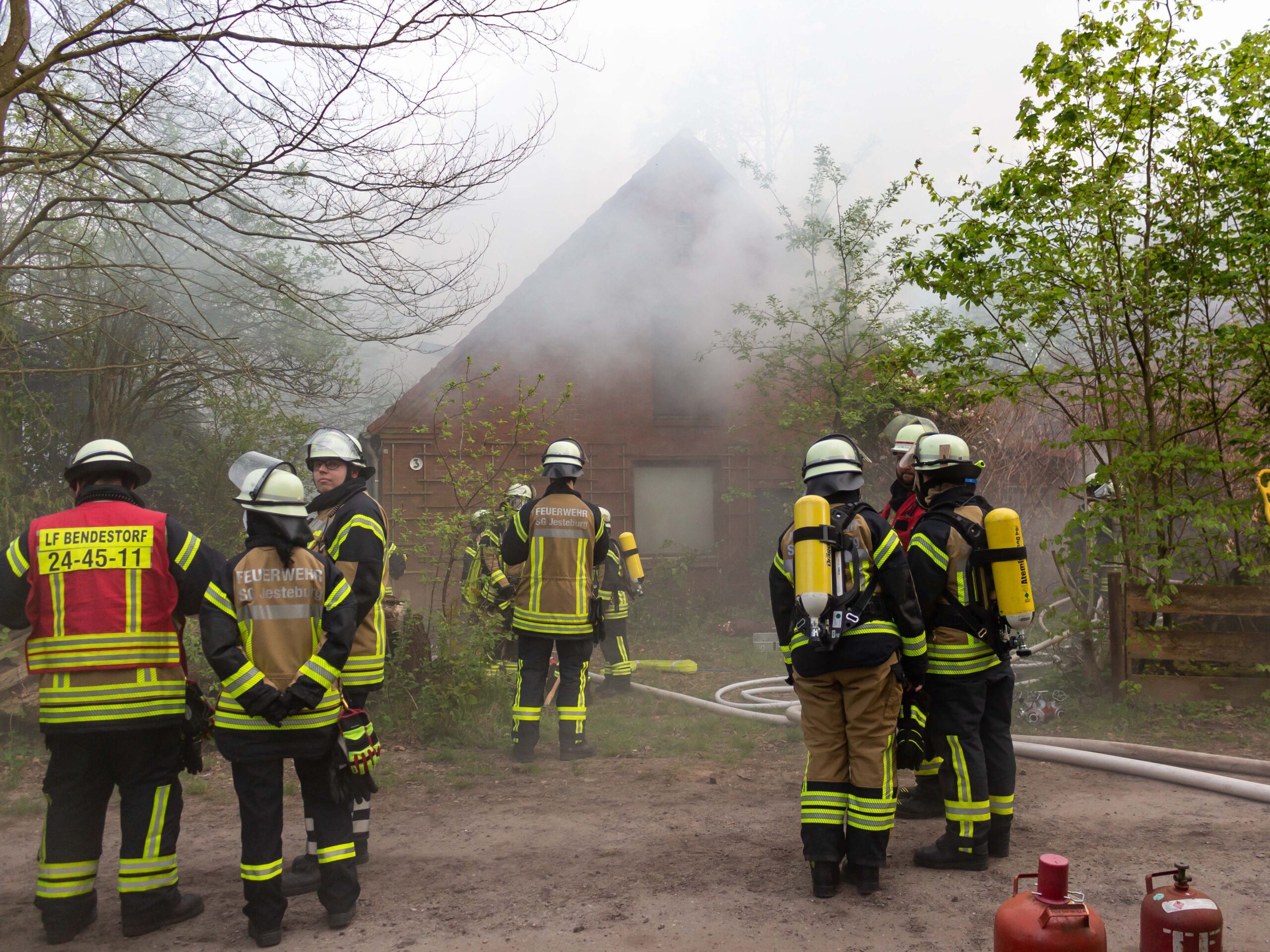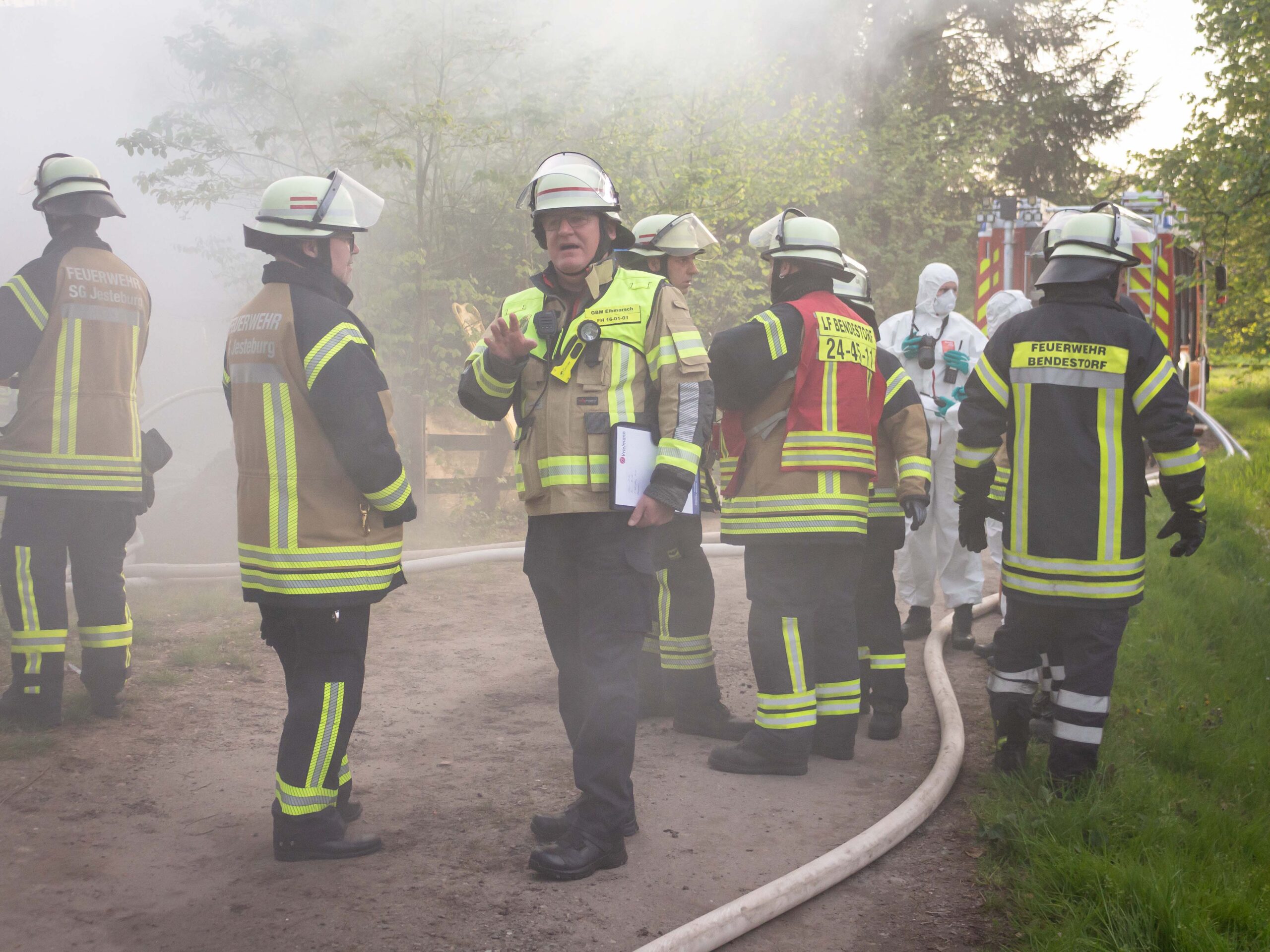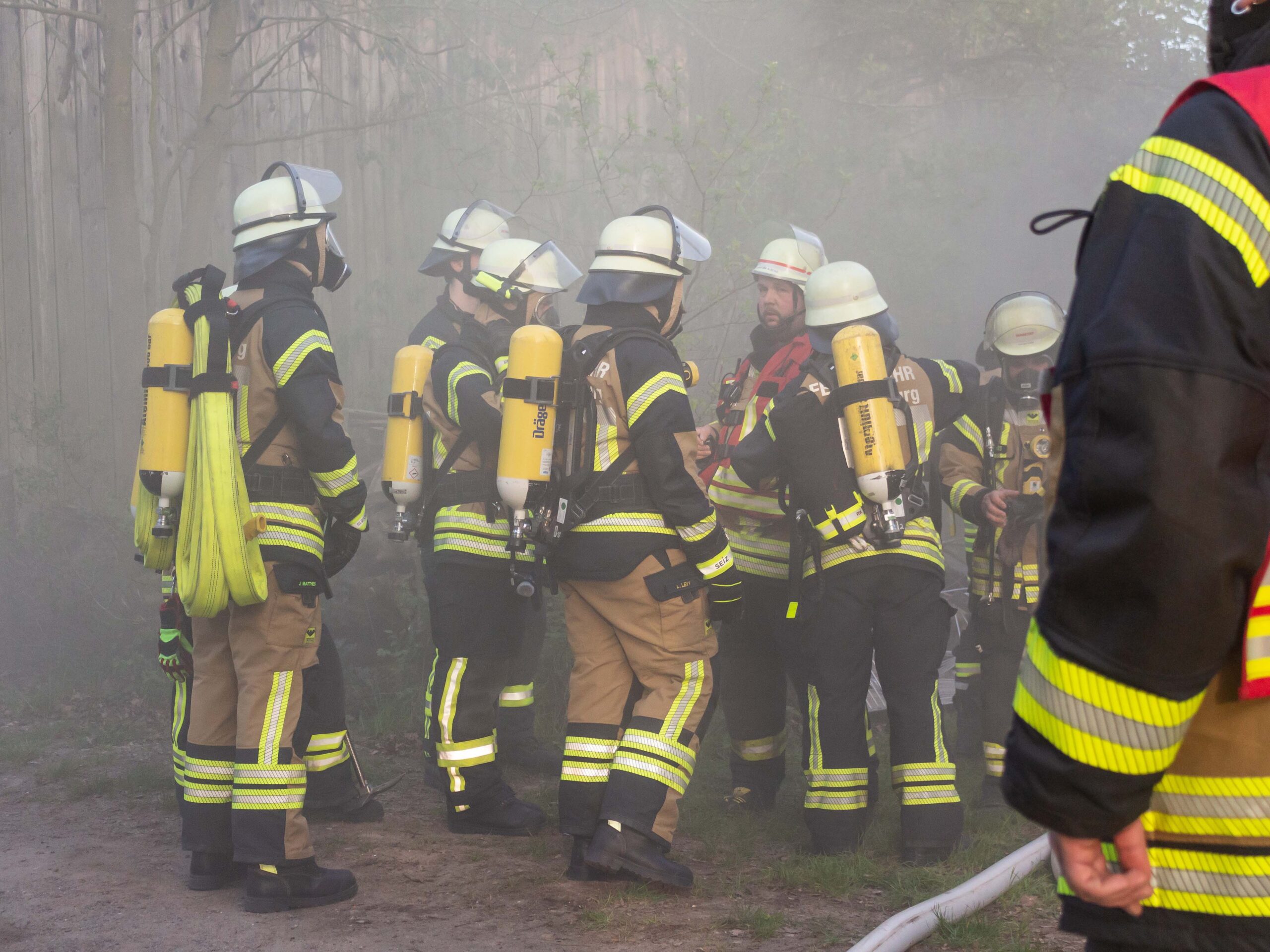 Die Alarmstufe wurde weiter erhöht: Es kam Unterstützung aus Lüllau, damit der Einsatz fortgesetzt werden konnte. Die Polizei führte Absperrmaßnahmen durch und spielte erste Ermittlungsergebnisse zur Übung mit ein: Die vermissten Personen wurden außerhalb der Gefahrenstelle aufgefunden, sodass die Menschenrettung als abgeschlossen angesehen werden konnte. Die Brandbekämpfung stand im Vordergrund und konnte erfolgreich abgearbeitet werden.