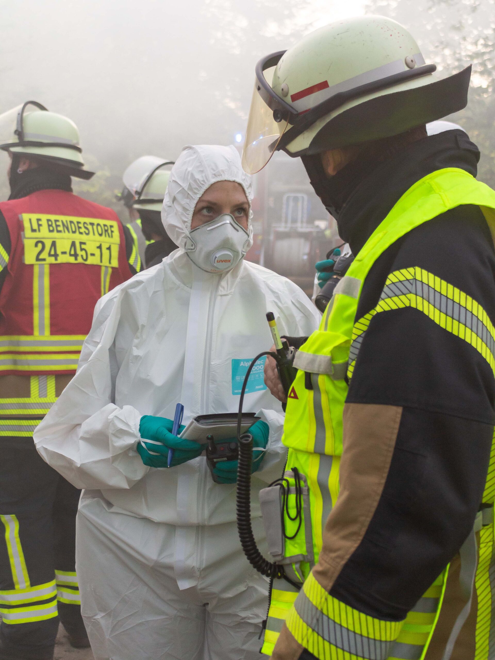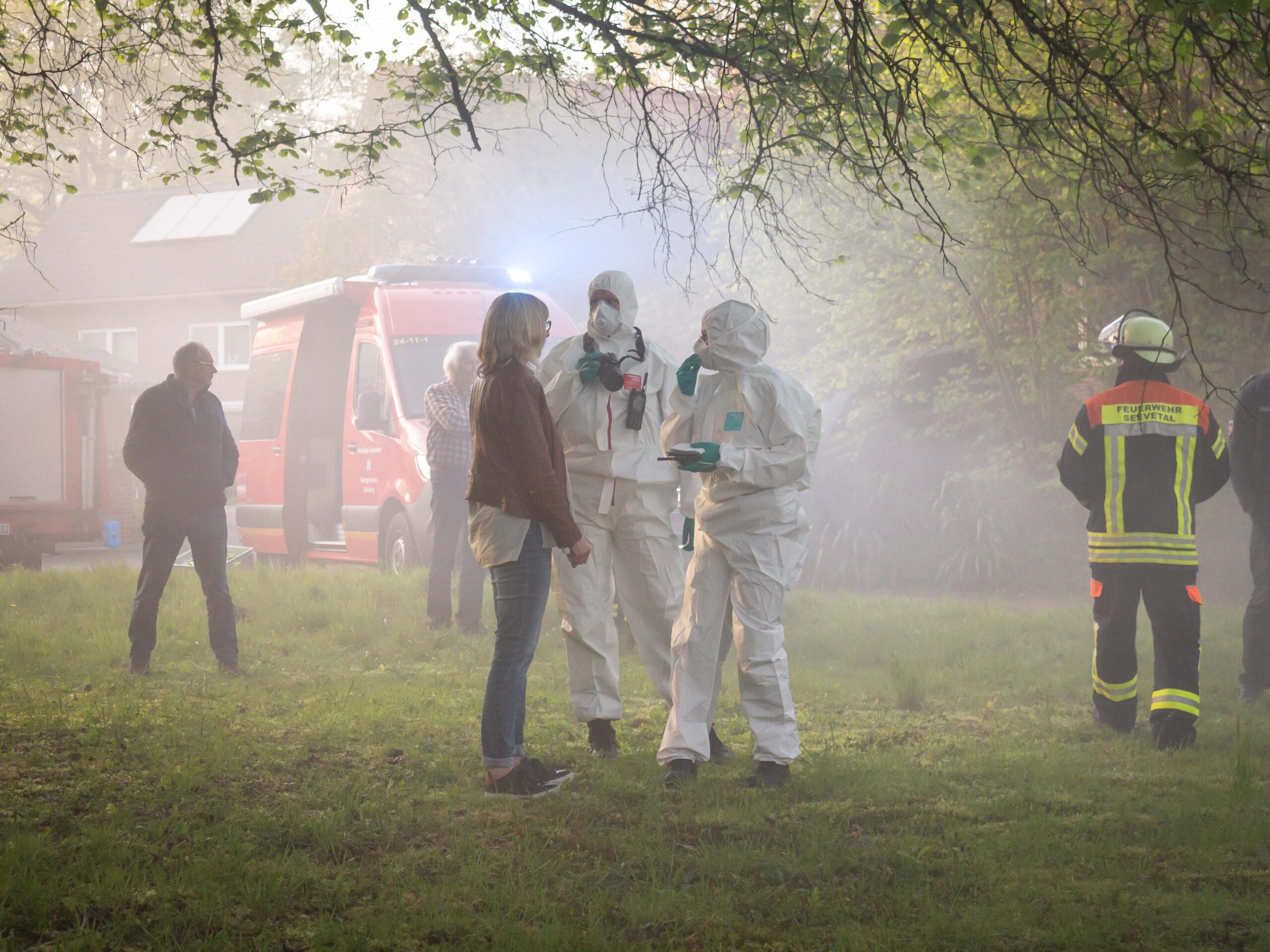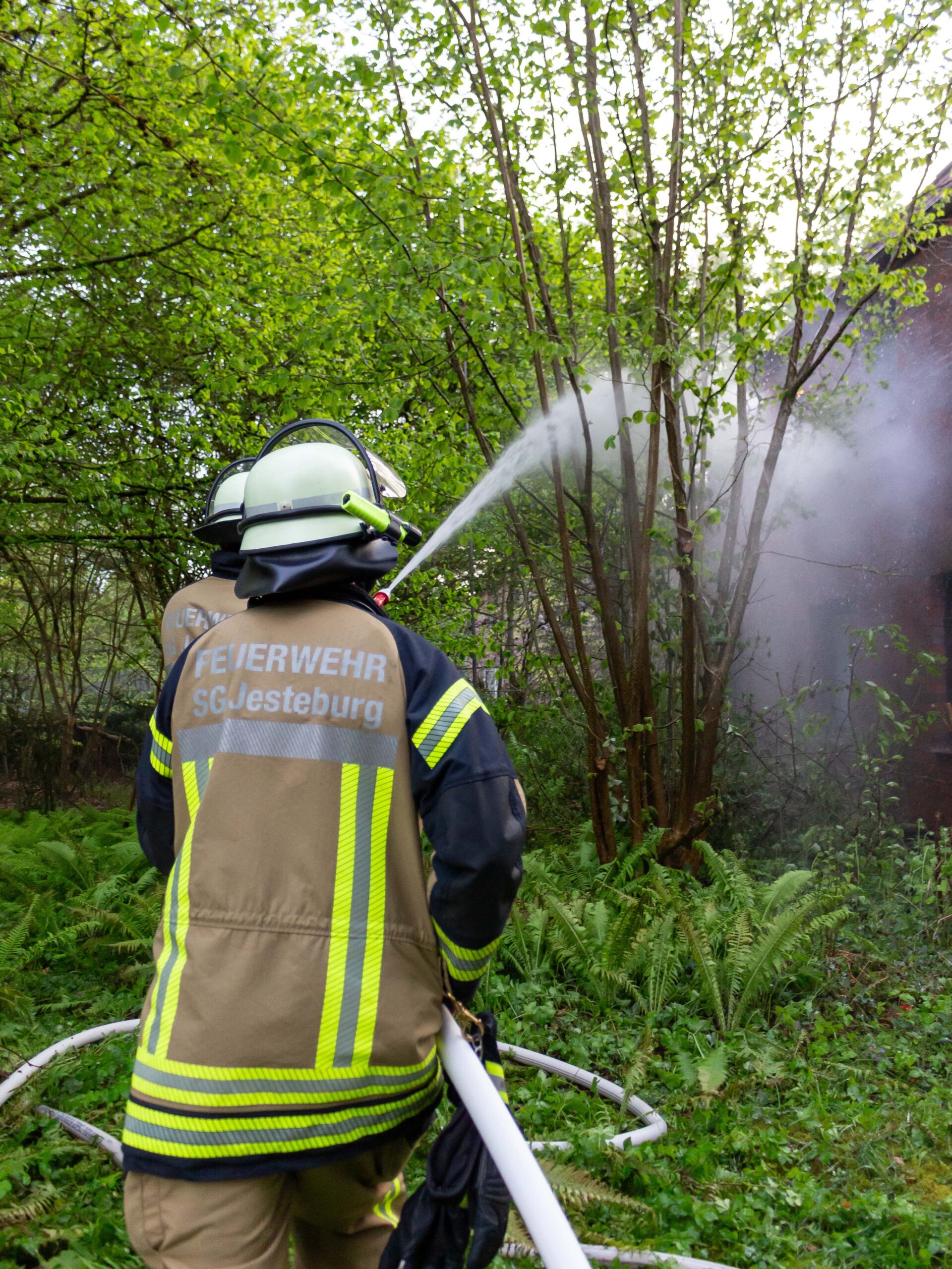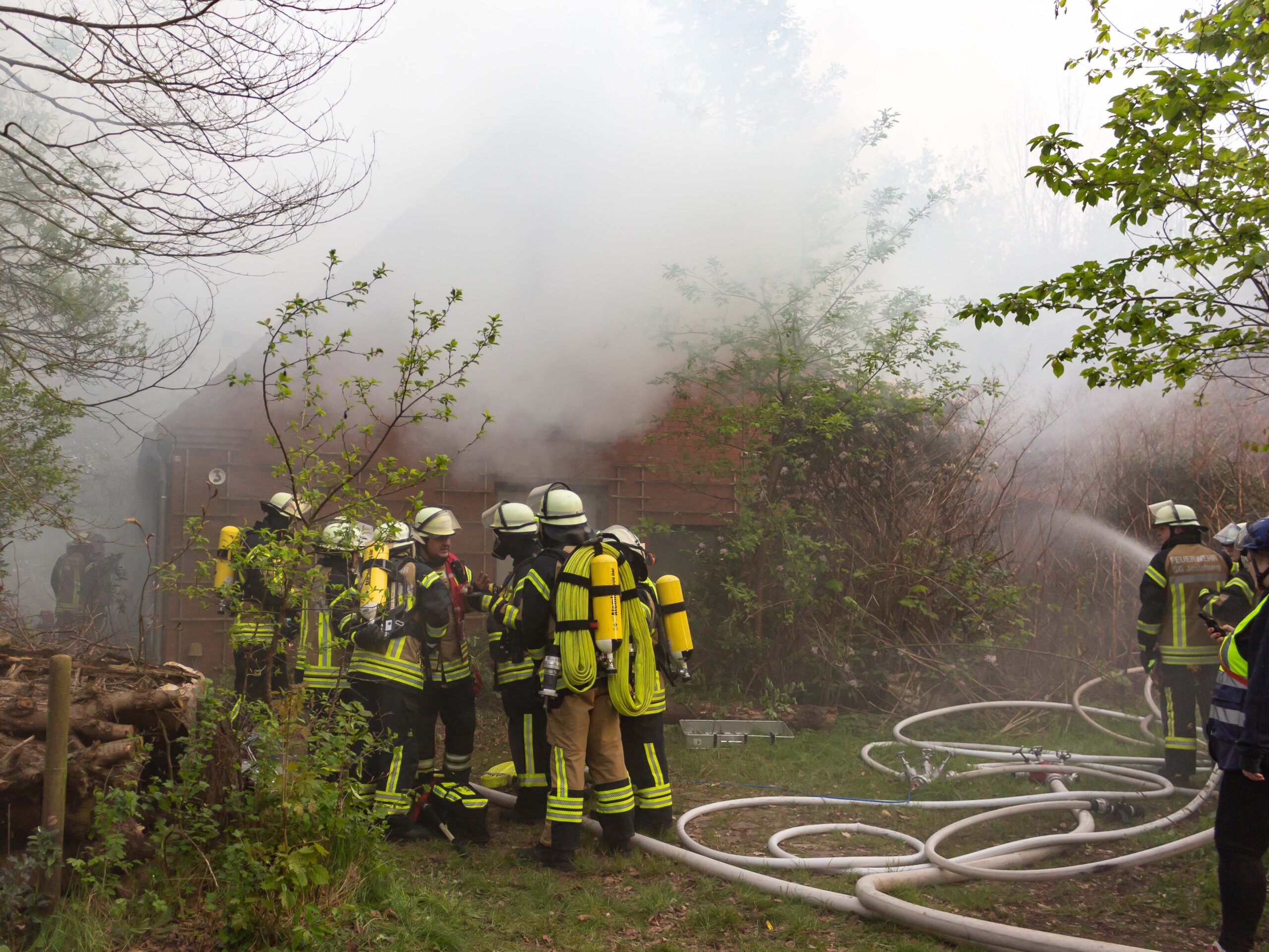 Die Alarmstufe wurde weiter erhöht: Es kam Unterstützung aus Lüllau, damit der Einsatz fortgesetzt werden konnte. Die Polizei führte Absperrmaßnahmen durch und spielte erste Ermittlungsergebnisse zur Übung mit ein: Die vermissten Personen wurden außerhalb der Gefahrenstelle aufgefunden, sodass die Menschenrettung als abgeschlossen angesehen werden konnte. Die Brandbekämpfung stand im Vordergrund und konnte erfolgreich abgearbeitet werden.